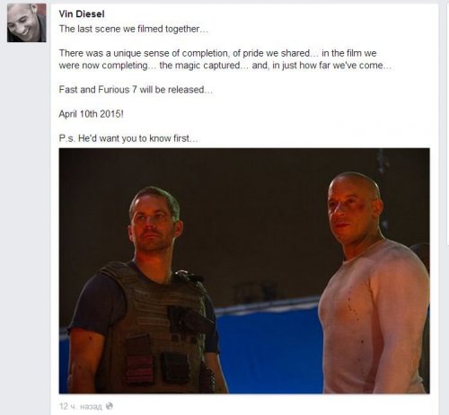 Актер Вин Дизель подтвердил дату выхода на экраны новой серии "Форсажа" - это случится 10 апреля 2015 года. Сначала фильм хотели выпустить уже в июле 2014, но из-за смерти Пола Уокера с этим возникли проблемы. Дизель - продюсер и исполнитель главной роли - написал о дате выхода "Форсажа 7" в своем Facebook, где также опубликовал кадр из последней сцены, в которой снимался вместе с Уокером.