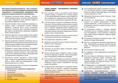 В памятке содержатся полезные советы, а также описываются варианты действий в различных ситуациях, например, когда человек оказался во время подземного толчка за рулем автомобиля, в общественном транспорте или на работе. Текст информационной листовки изложен в максимально доступной форме, понятной как взрослому, так и школьнику. Также памятка содержит все телефоны экстренных служб, которые могут понадобиться при возникновении чрезвычайной ситуации.