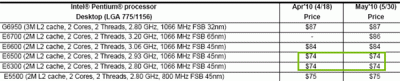 Если перейти по этой ссылке и скачать официальный прайс-лист на процессоры компании Intel, то можно обнаружить, что модель Pentium E6300 (2,8 ГГц) имеет схожую цену с более высокочастотным Pentium E6500 (2,93 ГГц). Выбор в данном случае очевиден, конечно же, приятнее получить лишнее 130 МГц. В документе под номером PCN 110010-00 сказано о начале запуска программы по снятию с производства процессора Pentium E6300.