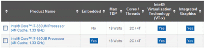 Для таких систем процессорный гигант представил два новых чипа - Celeron U3405 и Core i7-660UE. Эти модели представляют собой не что иное, как несколько оптимизированные мобильные процессоры Celeron U3400 и Core i7-660UM. Соответственно, перед нами представители архитектуры Arrandale.