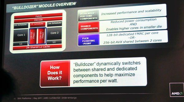 Компания отмечает, что процессоры архитекторы Bulldozer используют модульный дизайн. Каждый модуль объединяет два ядра с независимой кеш-памятью L1 и общей L2. процессоры высокого класса имеют 4 модуля и, соответственно, 8 ядер. Компания отмечает, что это первый одночиповый 8-ядерный настольный процессор.