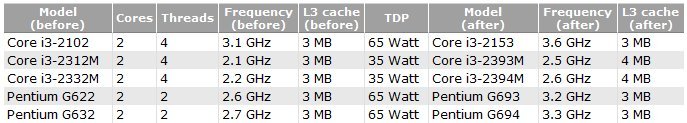 Кроме выпуска нового процессора, Intel обновила спецификации существующих моделей серии, включая представленный в сентябре Pentium G632 . После апгрейда он распознаётся как G694 с тактовой частотой 3,3 ГГц, что на 600 ГГц больше, чем у неразблокированной версии.