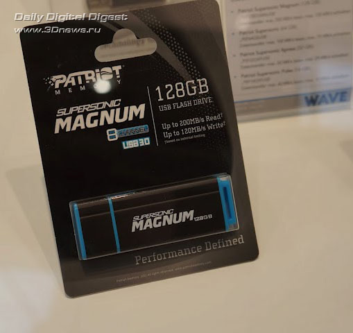 Помимо новых флеш-дисков серии Wildfire, компания Patriot привезла на выставку CeBIT 2012 ещё множество других интересных устройств. Для тех, кто не желает с собой носить большие SSD-накопители, производитель предложил флеш-брелок Supersonic Magnum с высокоскоростным интерфейсом USB 3.0. Эта новинка отличается ёмкостью 128 Гбайт и характеризуется скоростями чтения/записи до 200/120 Мбайт/с соответственно.