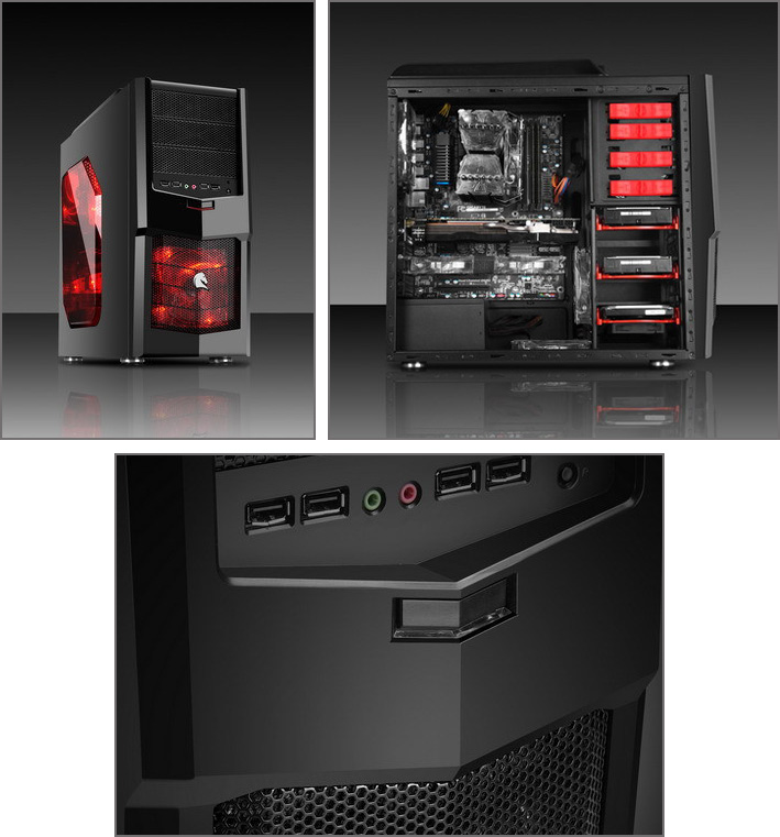 Новинка изготовлена в форм-факторе Mid Tower из стали марки SECC и прочного пластика, окрашена в чёрный цвет снаружи и внутри, имеет большое прозрачное окно на боковой стенке и обладает габаритами 450 x 200 x 420 мм. Изделие располагает семью слотами расширения и готово вместить четыре 5,25-дюймовых устройства, шесть 3,5-дюймовых накопителей, материнскую плату стандарта ATX или Micro-ATX, а также видеокарты длиной до 300 мм. В комплект поставки изначально включены сразу пять 120-миллиметровых вентиляторов, некоторые из которых снабжены красной светодиодной подсветкой. Набор выведенных наружу интерфейсов состоит из квартета портов USB 2.0, с которыми соседствуют гнёзда для подсоединения наушников и микрофона.