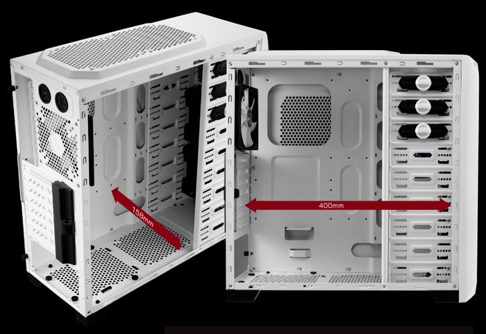 Новинка с габаритами 460 x 200 x 455 мм изготовлена из листов стали толщиной 0,5 мм, совместима с материнскими платами стандартов Micro-ATX/ATX, имеет семь слотов расширения, готова принять на борт видеокарты длиной до 400 мм и допускает применение CPU-кулера высотой до 158 мм. Модель оборудована восемью 5,25-дюймовыми внешними отсеками и может вместить до шести 3,5- либо 2,5-дюймовых накопителей. В комплект поставки изначально входит только один 120-миллиметровый тыловой вентилятор, однако при желании количество «пропеллеров» можно самостоятельно увеличить до двенадцати у версий без прозрачного окна и до десяти у модификаций с прозрачным окном. Кроме того, есть возможность использования системы жидкостного охлаждения, для прокладки шлангов которой на задней стенке высверлены специальные отверстия. Набор выведенных на лицевую панель интерфейсов состоит из двух портов USB 3.0 и пары стандартных аудиоразъёмов. Под ними расположен небольшой дисплей, отображающий текущую температуру внутри корпуса.