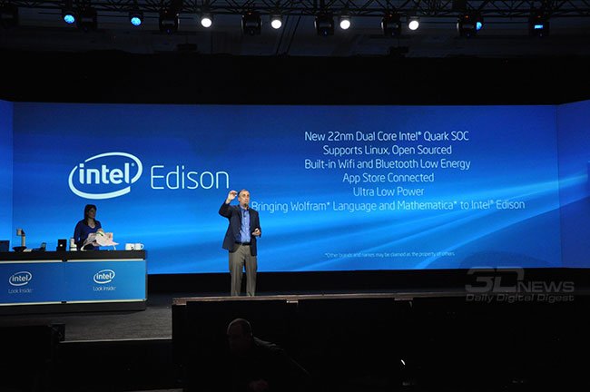 Ещё одним весьма интересным показанным на CES продуктом стал мини-ПК Edison, который выполнен в формате обычной SD-карты. В основе компьютера лежит двухъядерный однокристальный 22-нм чип Quark, есть встроенная поддержка соединений Wi-Fi и Bluetooth. Edison работает на платформе Linux и даже имеет свой собственный магазин приложений.