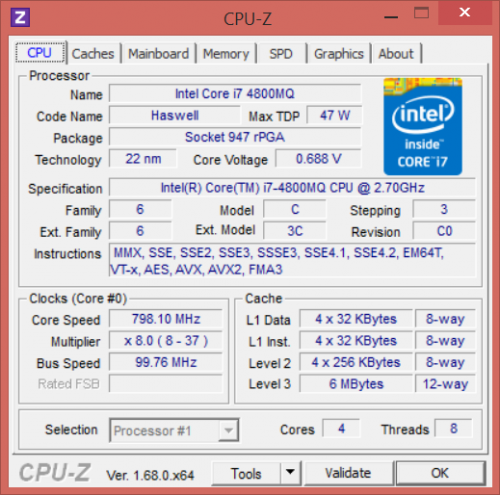 В нашей модификации MSI GT60 2PC Dominator был установлен процессор Intel Core i7-4800MQ. Его тактовая частота составляет 2,7 ГГц, а при использовании режима Turbo Boost она может увеличиваться почти на треть, до 3,7 ГГц. Этот CPU — один из самых мощных в современной мобильной линейке Intel Core i7 — разница между ним и самым-самым мощным мобильным процессором Intel (Core i7-4910 MQ) составляет всего 200 МГц и 2 Мбайт кеша L3. Разрыв сам по себе не очень большой, а уж в реальных условиях, а не в бенчмарках, он будет практически незаметным.