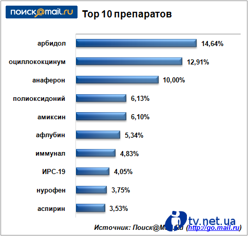 При этом выяснилась интересная тенденция. Мужчины при выборе лекарственных средств больше подвержены воздействию рекламы и предпочитают не лечиться или заниматься профилактикой организма, а снимать симптомы заболевания. Наиболее характерные для мужчин лекарства – аспирин, «ТераФлю», полиоксидоний, «Пенталгин» и «Темпалгин». Таким образом, в списке только один иммуномодулятор (на третьем месте), остальное – жаропонижающие и болеутоляющие средства. Что же касается женщин, то они одинаково активно запрашивают информацию по широкому спектру лекарств. Поиск@Mail.Ru постоянно проводит исследования предпочтений и интересов интернет-аудитории, многие из которых готовятся в партнерстве с ведущими СМИ и крупнейшими компаниями в самых разных сферах жизни. В числе анализируемых тем – знаменитости, кино, ТВ, кулинария, бытовая техника, автомобили и многое другое. Тексты всех исследований доступны на специальном проекте «Рейтинги» (http://trends.mail.ru).