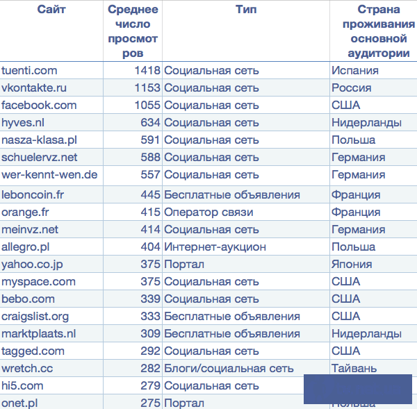 Посетители наиболее популярного по этому показателю сайта Tuenti - испанской социальной сети - в среднем за день просматривают более 47 страниц. Чуть более скромные, хотя все равно потрясающие воображение результаты, демонстрируют социальные сети Facebook и «В Контакте».