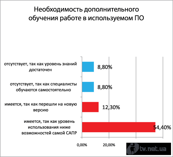 52,6% опрошенных признают обоснованность ежегодного выпуска компаниями-разработчиками новых версий САПР; 33% – согласны со средней стоимостью одной лицензии. Шестьдесят процентов участников опроса регулярно пользуются технической поддержкой продуктов. Несмотря на высокие показатели удовлетворенности специалистов используемыми системами, 66,7% из них сообщили, что испытывают необходимость в дополнительном обучении работе в установленных системах автоматизированного проектирования.