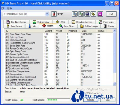 Чтобы сразу узнать о наличии ошибки в новенькой материнской плате на базе логики Intel 6x (Cougar Point) можно проделать небольшой эксперимент. Румынские коллеги с сайта Lab501 предлагают воспользоваться для этого утилитой HDTune, которая позволит поставить правильный диагноз контроллеру SATA. Необходимо запустить утилиту и выбрать вкладку «Health». Диагноз здорового чипсета будет таковым.
