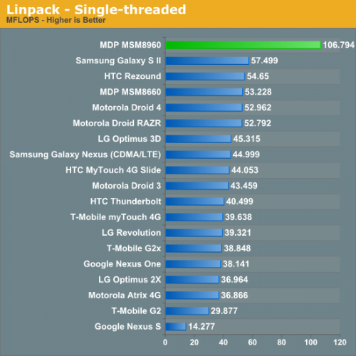 Все в порядке у Krait и с производительностью. Новый процессор протестировали в популярных бенчмарках. Почти везде он значительно превосходит нынешние модели, правда, в графических тестах чувствует себя уже не так уверенно.