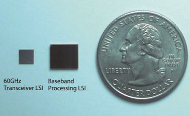 - Новая разработка состоит из 60 ГГц трансивера, процессора обработки ВЧ сигнала с возможностью обработки MAC (Media Access Control) пакетов - На 50% меньше чем предыдущая разработка Panasonic, поддерживая при этом 9 ГГц полосу пропускания в 60 ГГц нелицензируемом (в Европе и Японии) частотном диапазоне - Низкое энергопотребление при обработке MAC пакетов - Новая высокоточная кольцевидная топология схемотехники, позволяющая преодолеть ограничение на расстояние между транзисторами, необходимого для 60 ГГц несущей частоты, обеспечивая тем самым заметное уменьшение в размерах самого чипа.