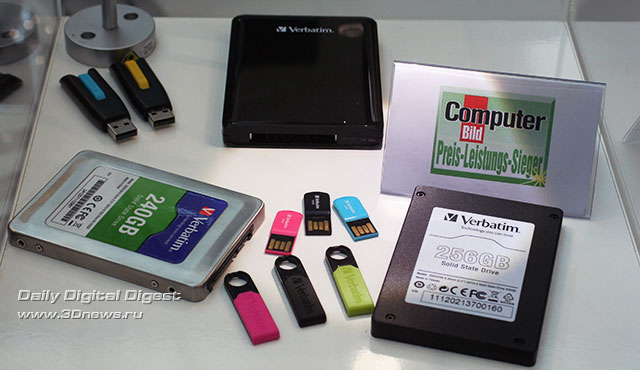 На прошедшей выставке CeBIT 2012 свои продукты в области хранения данных представила и компания Verbatim. Её выставочный стенд напоминал торговые стеллажи в магазине — слишком уж много экземпляров одинаковых продуктов было выставлено на обозрение пользователям.