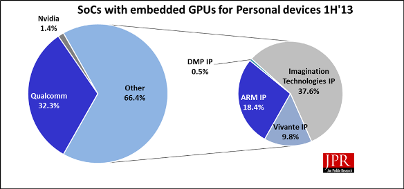 Мировым лидером по объёму поставок мобильных графических чипов продолжает оставаться компания Imagination Technologies, самым известным продуктом которой являются GPU семейства PowerVR. Об этом говорят данные аналитической компании Jon Peddie Research: став поставщиков чипов для устройств компании Apple, Imagination вышла в лидеры и уже не упускала первого места. В недавно представленном iPhone 5S и его SoC A7 используется новый GPU Rogue серии 6.