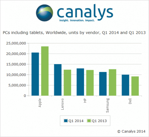 Из других производителей ПК поставки упали только у Samsung, остальные представители первой пятёрки свои показатели с прошлого года увеличили. В целом за первый квартал было поставлено 123,7 ПК и планшетов, что по сравнению с годичной давностью равнозначно росту в 5%. На планшеты из этого числа пришлось 41% (50,8 млн.), тогда как ноутбуки занимают 38% поставок. Рост поставок аналитики связывают с прекращением поддержки Windows XP.