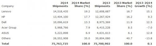 По оценкам аналитиков, во втором квартале 2014 года общемировые поставки ПК составили 75,8 млн единиц, что на 0,1 % больше, чем годом ранее. Аналитик Gartner Микако Китагава (Mikako Kitagawa) говорит, что стабилизация компьютерного рынка в развитых странах смогла компенсировать спад в регионах с развивающейся экономикой, где местные жители активно приобретают дешёвые планшеты взамен десктопам или ноутбукам.