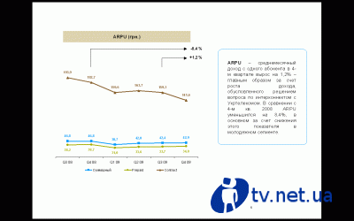 * ARPU — середньомісячний дохід із одного абонента у 4-му кварталі зріс на 1,2% — переважно за рахунок збільшення доходу, обумовленого вирішенням питання щодо інтерконнекту з Укртелекомом. Порівняно з 4-м кв. 2008 ARPU зменшився на 8,4%, переважно за рахунок зниження цього показника у молодіжному сегменті.
