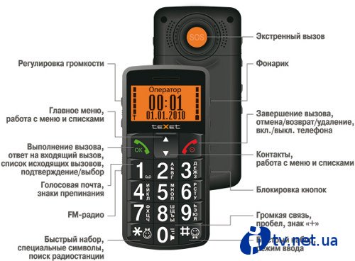 Значительно увеличены кнопки номеронабирателя (14х12 мм) и цифры (высота цифр 9 мм). Увеличен размер шрифта, который отображается четкими буквами на монохромном ЖК-дисплее с яркой оранжевой подсветкой. Высота ЖК-дисплея – 20 мм, этого достаточно для вывода 3 строк текста. Высота цифр, выводимых на дисплей при наборе номера, – 10-12 мм – это самый высокий показатель среди аналогов. На торцах телефона расположены специальные переключатели для быстрой блокировки кнопок, включения фонарика и FM-радио. Это особенно важно для пожилых людей с ослабленным зрением или затрудненной мелкой моторикой.