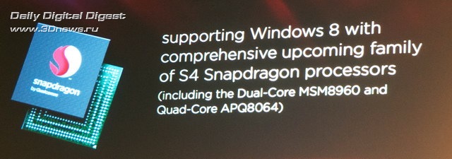 Компания с большим воодушевлением ждет выхода Windows 8, потому что версия этой операционной системы, выпущенная для разработчиков, способна работать на процессоре Qualcomm класса S4. По мнению Пола Якобса, это может привести к тому, что продукция его компании появится и в обычных компьютерах, потеснив архитектуру x86. Впрочем, пока не очень понятно – насколько версия Windows 8 для ARM будет отличаться от обычной.