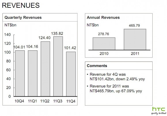 За 2011 год выручка HTC составила 465,79 млрд NT ($15,73 млрд), превысив прошлогодний показатель на 67,09%. Прибыль компании в четвертом квартале снизилась по сравнению с аналогичным периодом 2010 года на 12% до 27,5 млрд NT ($933 млн).