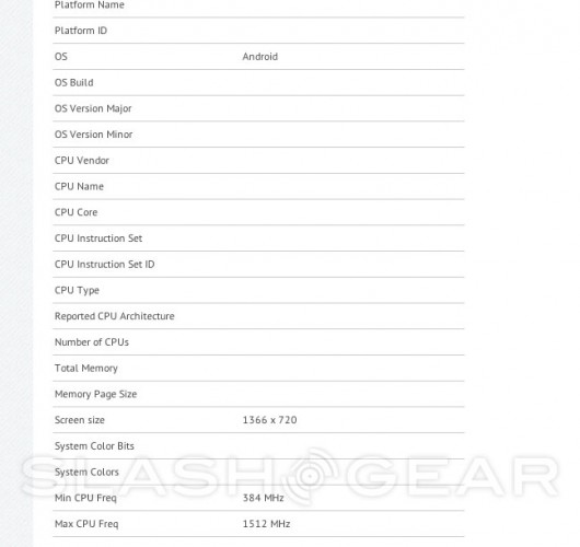 В основе устройства, если это реальный аппарат, лежит 2-ядерный 1,5-ГГц процессор Qualcomm S4. Кроме процессора, упоминается и вполне солидное разрешение экрана — 1366x720 точек. Видимо, речь идёт об аппарате высокого класса.