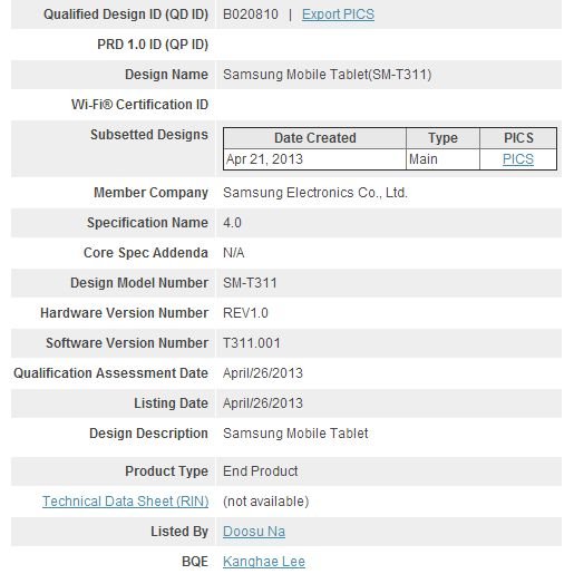 На сайте организация Bluetooth SIG появилась информация о планшете Samsung с номером модели SM-T311, свидетельствующая об успешном завершении регистрации устройства. Согласно данным ресурса SamMobile, наименование модели SM-T311 принадлежит Wi-Fi-версии неанонсированного планшета Galaxy Tab 3 8.0 (3G-версии планшета соответствует номер модели SM-T310).