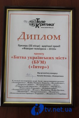 8 сентября 2010 г. Проект «Битва українських міст» вошел в тройку победителей премии «Фаворит телепрессы – 2010». Примечательно, что за четыре года существования этой теленаграды впервые медиаэксперты обратились за помощью к телезрителям и читателям издания «Телекритика», которое стало учредителем премии. И нам особенно приятно, что именно проект «БУМ» победил благодаря голосованию не только уважаемых телекритиков, но и наших любимых зрителей!