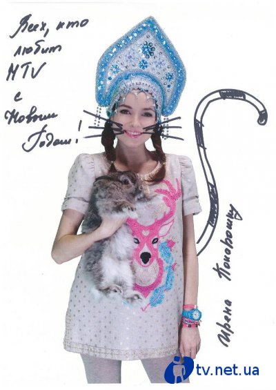 На этот Новый Год я хочу пожелать всем зрителям MTV, чтобы каждый день в будущем году приносил хотя бы пять минут счастья. Весной желаю обновления гардероба в соответствии с трендами, летом - самого яркого путешествия, осенью - согревающей любви, а зимой, как, в прочем и весь год, чтобы все оставались с «Тренди»», - примеряя кокошник, радостно кричит Снежина, ведущая программы «Тренди» на MTV.