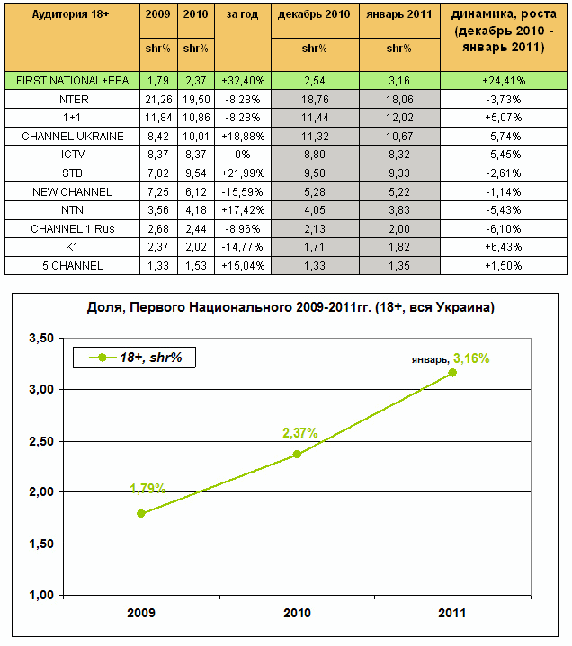 Результаты не заставили себя ждать – в сравнении декабря-2010 и января-2011 прослеживается резкая динамика роста. Это притом, что по результатам всего 2010 года Первый Национальный стал лидером по росту медиапоказателей с ростом в 32,4% (аудитория 18+ (вся Украина). Теперь канал снова улучшил собственные достижения. За последний месяц по аудитории 18+ (вся Украина) показатели Первого Национального среди основных телеканалов Украины выросли еще на 24,4% - с 2,54% до 3,16%.