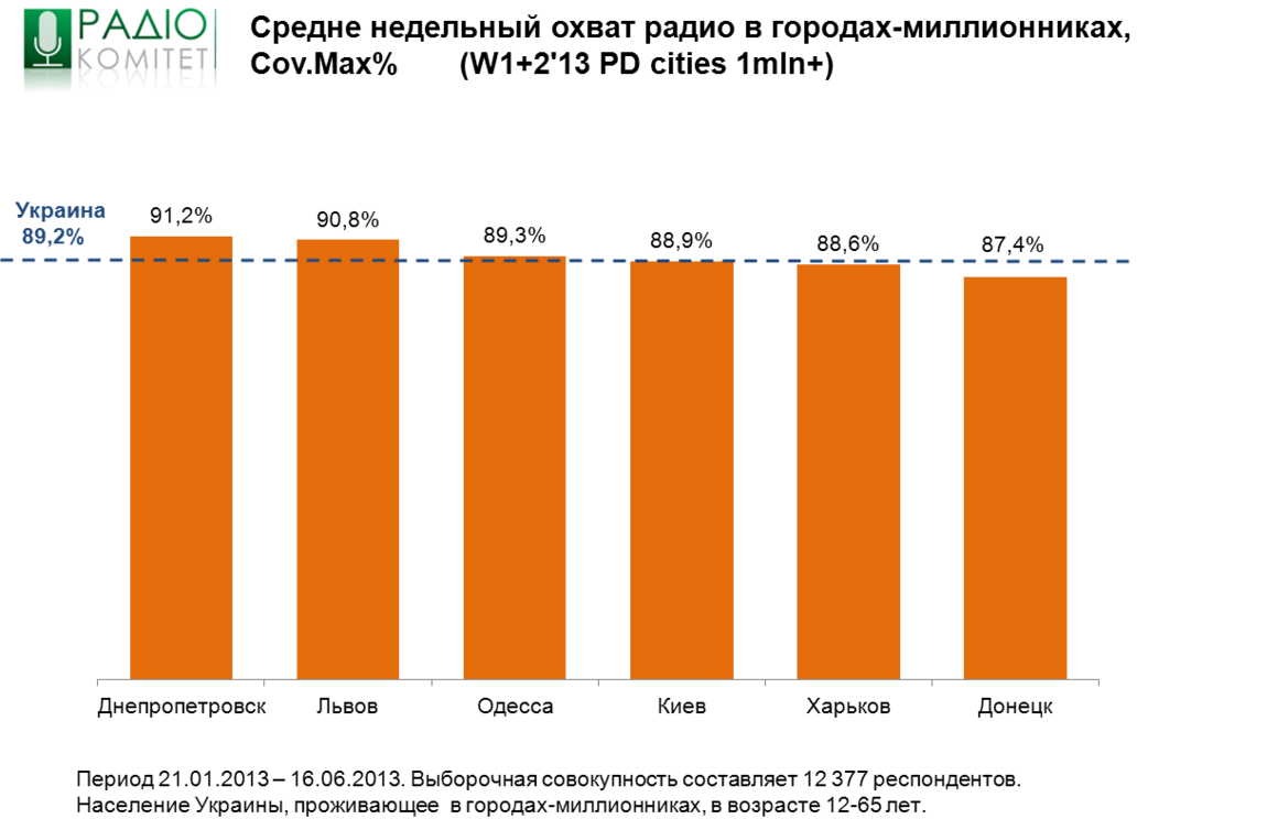 В городах — миллионниках радио слушают стабильно хорошо. Об этом говорят данные очередной волны исследования радиослушания, которые обнародовал Радиокомитет. Исследование проводит компания GfK по заказу отраслевого объединения "Радиокомитет". В соответствии с данными волны, количество украинцев, которые контактируют с радио на протяжении недели стабильно высокое, без существенных