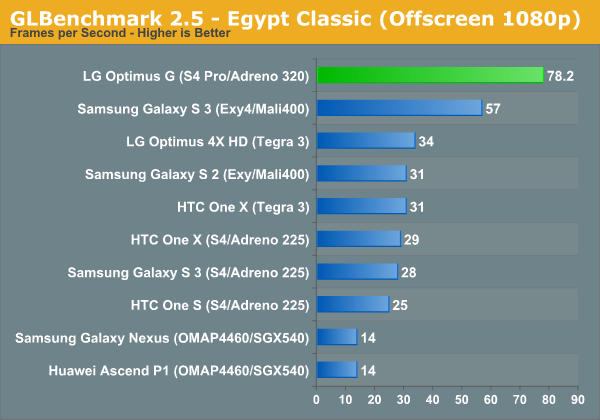 Наконец, журналисты провели тесты в GLBenchmark 2.5 GPU: Egypt Classic и HD, оба исполнялись за пределами экрана в разрешении 1080p с отключённой вертикальной синхронизацией — чтобы обеспечить максимальную нагрузку на графику. Вот уж где GPU нового поколения Qualcomm Adreno 320 смог себя показать: