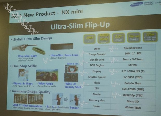 Сообщается, что в основу устройства ляжет 1-дюймовым сенсор с обратной засветкой, насчитывающий 20 млн пикселей. Обработкой изображений займётся процессор DRIMe IV. По имеющейся информации, модель NX Mini сможет осуществлять серийную съёмку со скоростью до 22 кадров в секунду, а также записывать видео высокой чёткости в формате Full HD (1920х1080 точек) со скоростью 30 кадров в секунду. Тип носителя информации — сменные карты памяти стандарта microSD.