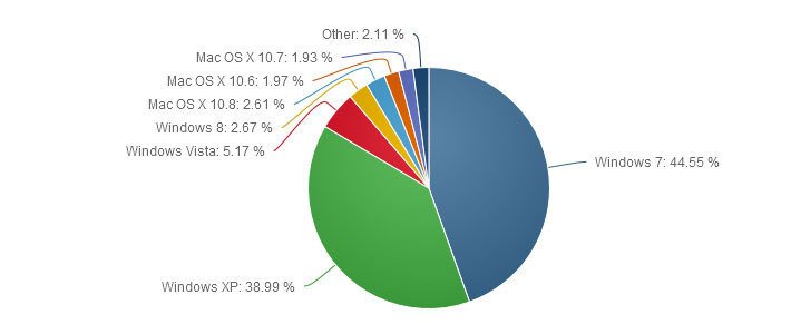 Второе место — у «долгожительницы» Windows XP (38,99%). Эта операционная система вряд ли скоро покинет компьютеры пользователей, даже несмотря на ее весьма преклонный возраст. Windows 8 потребуется некоторое время, чтобы догнать Windows Vista, сейчас их показатели составляют 2,67% и 5,17% соответственно.