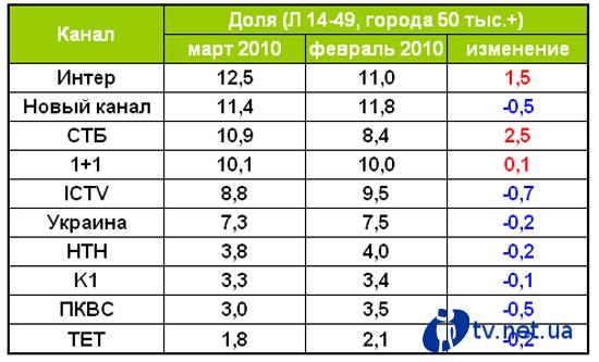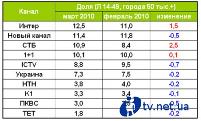 По аудитории 14-49, «Интер» отодвинул на вторую позицию февральского лидера - Новый канал. На третьем месте - канал СТБ, который в феврале был пятым.