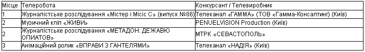 Через недостатню кількість телеробіт конкурс не відбувся. На підставі високих середніх балів за оцінками Головного журі, Почесний диплом «За професійну майстерність та успішне телевізійне втілення ідеї «Україна: Схід і Захід – разом!»»: